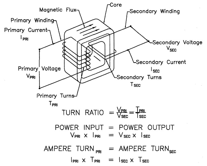 The change in the Voltage/Current in the primary to the Voltage/Current in the secondary is determined by the TURNS RATIO, see article in this blog